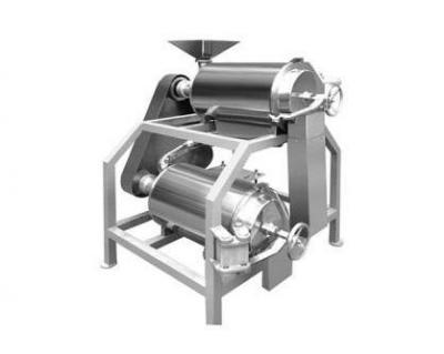 電動機通過皮帶傳動,使安裝在花鍵上的刮板高速旋轉,當經過破碎的水果通過進料口進入機內時,接漿盤就把物料均勻排發到刮板和篩網處。由於刮板的回轉作用和導程角的存在,使物料沿著圓筒向出口端移動,移動的軌跡呈螺旋狀,物料就在刮板和篩筒之間移動過程中受離心力的作用而被擦碎,汁液和肉質(已成漿狀)從篩孔中通過送入下道工序,皮和籽等則從出渣鬥排出,以達到自動分離的目的。隻要變換不同規格的篩網以及調整刮板導程角的大小, 可改變不同的打漿速度,獲得滿意的效果;
