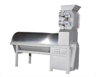 石榴從進料鬥進入上壓碎裝置,上壓碎裝置將石榴壓開,下壓碎裝置再次將石榴擠壓,經過兩級擠壓的石榴已基本皮籽分離,並落入分離裝置,石榴籽從篩孔落下,皮從尾部排出, 籽及汁用另配的螺杆泵送至下道工序。