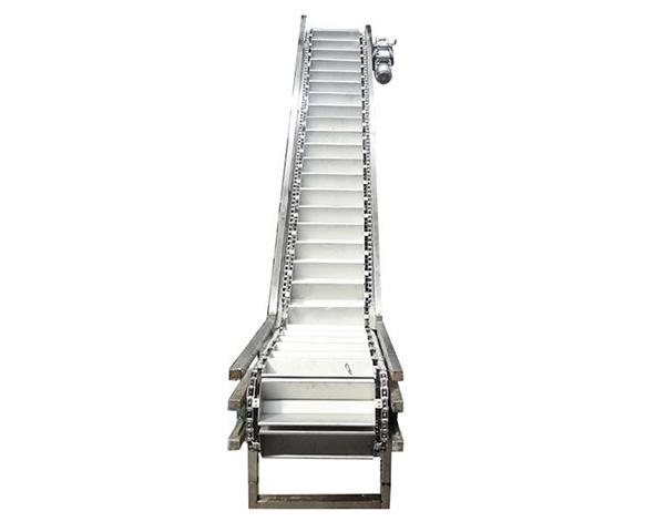 采用塑鋼網帶檔板或編織聚丙脂帶檔板作為載體,適用於各種食品行業的物料提升輸送等,根據要求設計噴淋和集水裝置.