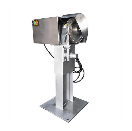 椰子剝殼機是將去棕後的椰子最外層堅硬的椰殼去掉,此款剝殼機是一種半自動化設備,機器主要由圓形刀盤、硬質合金刀頭、楔形頂料刀及減速電機等組成。機器工作時候,人工手握去棕椰子將其前段的胚芽口位置對準楔形頂料刀,下壓下去,此時轉動的剝刀盤與楔形頂料刀對放入其中的椰子形成了擠壓剝除力,從而順利將椰殼從椰肉剝離開。
